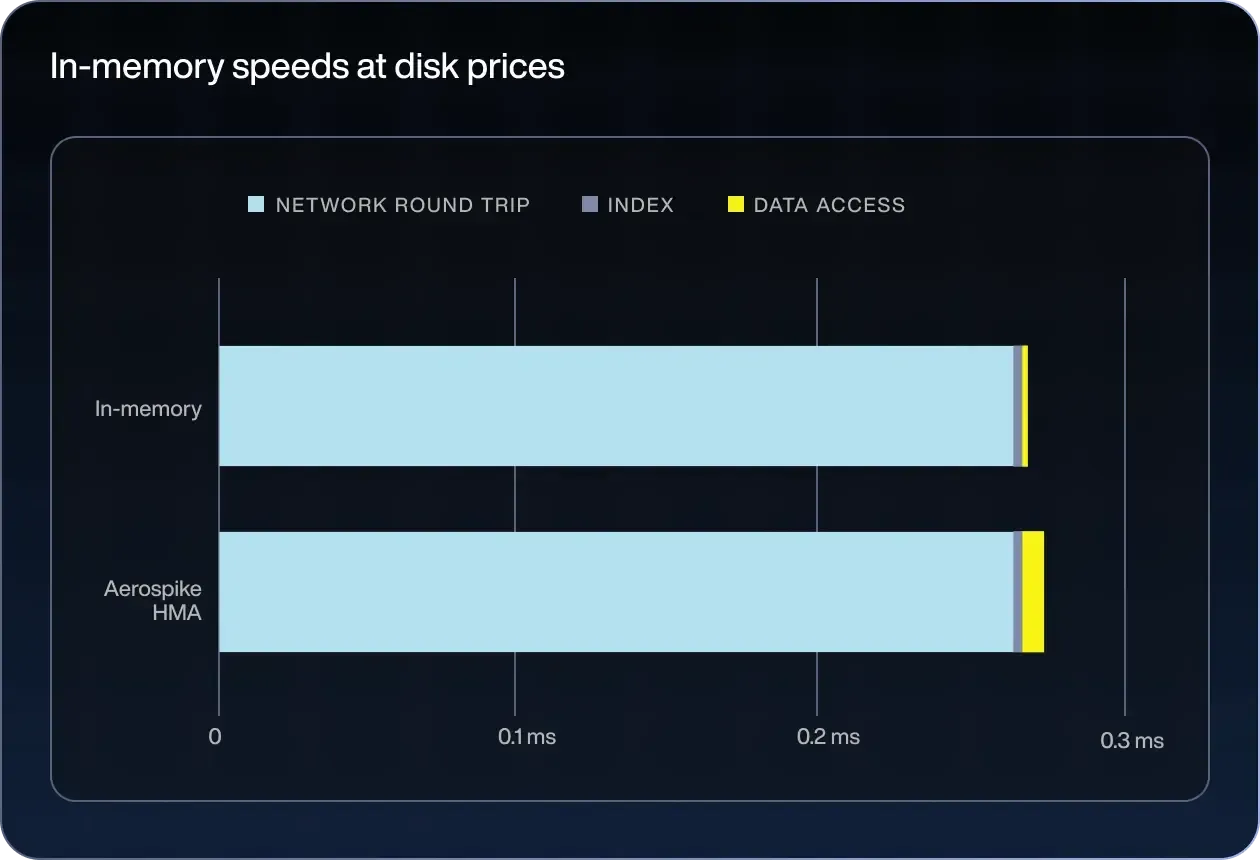 Aerospike’s patented Hybrid Memory Architecture delivers memory-like latency, with the durability and low cost of SSDs.